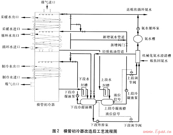 ① 在上段冷凝液泵總出口管道上增加一個閥門和循環(huán)氨水清掃管道。在冬季,將新增閥門關上,用循環(huán)氨水代替上段冷凝液對中段進行噴灑[3],中段的冷卻熱量由循環(huán)水通過涼水架換熱帶走,初冷器上、中段下來的冷凝液經水封槽進入上段冷凝液槽,用上段冷凝液泵直接抽送到機械化氨水澄清槽,可以避免初冷器清掃下來的萘又重新進入初冷器中堵塞初冷器。在其他季節(jié),將新增閥門打開,用上段冷凝液直接對中段進行噴灑以降低煤氣溫度。