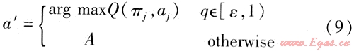 設(shè)當(dāng)前狀態(tài)πj={a1,a2,a3,…,aj}下螞蟻k位于節(jié)點j,螞蟻將按照ε-貪婪規(guī)則確定在節(jié)點j′要選擇的行為a′,即以概率1-ε按貪婪策略選取當(dāng)前狀態(tài)下最大Q值對應(yīng)的行為。而以概率ε隨機選擇一個當(dāng)前狀態(tài)下允許行為的表達式為: