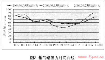 (2) 省公司對寶雞中燃實(shí)行均衡供氣。寶雞中燃用球罐進(jìn)行日調(diào)峰,大多都是晚上進(jìn)氣,白天出氣模式。匯一集氣罐上2009.09.05,2009.09.15,2009.09.25三天時(shí)間壓力曲線如圖2,基本上反映出匯一集氣罐壓力時(shí)間曲線。