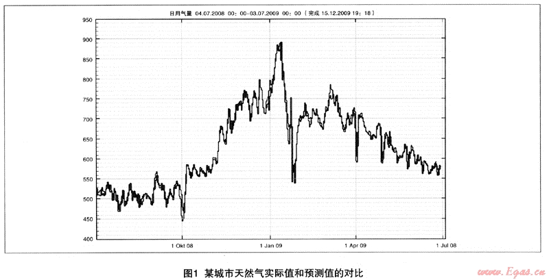 如同任何事件的發(fā)生一樣,天然氣供銷差的變化也是有一定預(yù)兆的,城市燃?xì)庳?fù)荷預(yù)測的及時(shí)與準(zhǔn)確對于“氣荒”的緩解有著重要的作用。國內(nèi)有的學(xué)者對于城市燃?xì)庳?fù)荷的長期、中期、短期預(yù)測技術(shù)進(jìn)行了大量研究,取得了可喜的進(jìn)展,在若干城市已經(jīng)實(shí)際應(yīng)用[18]。德國在貫徹歐洲議會和理事會保障安全節(jié)能的天然氣供應(yīng)的法規(guī)時(shí),要求各城市燃?xì)馍蠄?bào)未來3天的用氣量預(yù)測誤差控制在5%以內(nèi)。此舉促進(jìn)了燃?xì)忸A(yù)測方案的發(fā)展,對國內(nèi)燃?xì)獾念A(yù)測工作有借鑒意義[19]。國內(nèi)某城市的燃?xì)庥脷饬拷?jīng)德國慕達(dá)燃?xì)忸A(yù)測系統(tǒng)的分析,在給出了1年的用氣量和天氣數(shù)據(jù)的前提下,7天內(nèi)的預(yù)測誤差為1.75%,實(shí)際值和預(yù)測值的對比曲線見圖1。如能利用燃?xì)庳?fù)荷預(yù)測技術(shù)對于氣象干擾的影響能準(zhǔn)確的預(yù)測,加上及時(shí)的調(diào)度,對于天然氣供應(yīng)系統(tǒng)“氣荒”的避免將具有重要的意義。