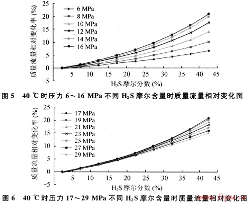 圖5、6分別給出了基于前述基準(zhǔn)條件,40℃時(shí)壓力為6~16MPa、17~29MPa和不同HzS摩爾含量時(shí)質(zhì)量流量變化情況??梢娰|(zhì)量流量變化主要受到H2S含量的影響,均隨H2S摩爾分?jǐn)?shù)增加而增加。相同H2S摩爾分?jǐn)?shù)時(shí),6~16MPa的質(zhì)量流量隨壓力增加的變化速度明顯加快,而在19~29MPa范圍時(shí)又隨壓力增加變化速度變慢。