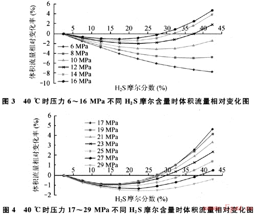 圖3、4分別給出了基于前述基準(zhǔn)條件,40℃時(shí)壓力為6~16MPa、17~29MPa和不同H2S摩爾分?jǐn)?shù)含量時(shí)體積流量相對(duì)變化情況。由圖3、4可知:在所列H2S摩爾分?jǐn)?shù)范圍內(nèi),隨著H2S含量增加,6~8MPa范圍內(nèi)體積流量變化始終負(fù)增長(zhǎng),呈下降趨勢(shì);12~16MPa,17~27MPa的體積流量變化均開始負(fù)增長(zhǎng),后正增長(zhǎng);10MPa時(shí)與29MPa時(shí)類似,分別在H2S摩爾分?jǐn)?shù)為25%、20%附近時(shí)體積流量降至最低,分別降低3%和1.6%。