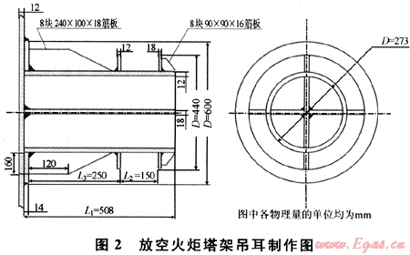 經(jīng)過核算,放空火炬塔架上、下段吊耳均選擇兩個管軸式吊耳,管軸采用Ø273mm×12mm無縫鋼管,材質(zhì)Q345B,其余材質(zhì)Q235B,吊耳懸臂長度400mm,吊耳制作如圖2所示。