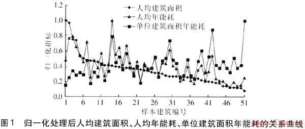 基于統(tǒng)計(jì)數(shù)據(jù)得到51幢樣本建筑的人均建筑面積、人均年能耗、單位建筑面積年能耗,為便于分析,對(duì)這3項(xiàng)數(shù)據(jù)進(jìn)行了歸一化處理。將51幢公共建筑按歸一化處理后的人均建筑面積由大到小進(jìn)行編號(hào),三者的關(guān)系曲線見圖1。由圖1可知,隨著人均建筑面積的增加,人均年能耗呈現(xiàn)上升的趨勢(shì),而單位建筑面積年能耗呈現(xiàn)下降的趨勢(shì)。