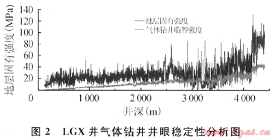 進(jìn)行分析評(píng)價(jià)。利用此方法對(duì)七里北101井、龍17井及LGX井氣體鉆井井段實(shí)鉆資料驗(yàn)證分析表明,當(dāng)?shù)貙幽滁c(diǎn)的巖石固有強(qiáng)度小于氣體鉆井條件下保持井壁穩(wěn)定的臨界強(qiáng)度時(shí),井壁不穩(wěn)定,否則井壁處于穩(wěn)定狀態(tài)。