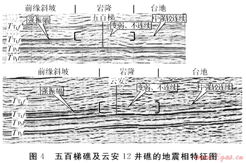 通過圖4五百梯礁以及云安12井礁等地震剖面分析,由圖4可見,對長興組生物礁識(shí)別方法歸納如下:①生物礁礁前至前緣斜坡-海槽相剖面段,長興組頂界反射能量明顯增強(qiáng);且互相獨(dú)具有良好的連續(xù)性和光滑性,在生物礁礁后至臺(tái)地相,其反射層振幅雖較前緣斜坡,海槽相弱,但連續(xù)性明顯優(yōu)于生物礁(灘)段反射。正是由于其區(qū)域地震相特征,顯示并指示出生物礁(灘)發(fā)育的剖面具體位置。②臺(tái)緣生物礁均發(fā)育在前緣斜坡-臺(tái)地間的坡折處,常與海槽相平行,相帶相對狹窄。③礁前、礁后地震相(包括振幅、連續(xù)性等)屬性發(fā)生橫向突變現(xiàn)象。④礁體自身地震相(如反射外形、振幅、連續(xù)等屬性),由于局部沉積環(huán)境不同存在一定差異,但都具有反射絮亂,不連續(xù)的基本特征。⑤其分布完全與現(xiàn)今構(gòu)造的展布無關(guān)。需要指出的是,垂直臺(tái)地-海槽相帶的地震測線其預(yù)測可靠性相對更高。