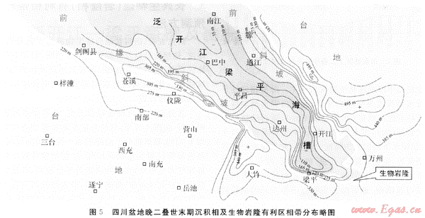 圖5是晚二疊世末期沉積相及生物礁(灘)有利區(qū)平面分布略圖,它清晰地展示出川北廣元-旺蒼海槽與川東開江-梁平海槽同屬一體,共同組成整個(gè)四川盆地的泛開江梁平海槽。該海槽呈西北向分布,上二疊統(tǒng)沉積厚度為55~165m,由川北大巴山山前廣元、南江一帶向南東到巴中、平昌沿線直至川東宣漢,于梁平附近消失,全長約320km。海槽水體由西北向東南變淺,由川北寬闊海床向川東逐漸收縮呈狹窄海灣之勢;沉積厚度隨著海槽海水向東南變淺而增厚;環(huán)海槽呈帶狀生物巖隆帶模式的生物礁(灘)有利區(qū)帶沿西岸川北劍閣-川中儀隴-川東龍會(huì)-梁平沿線附近,東岸沿川北樓子廟、川東黃金口一帶展布。整個(gè)巖隆有利區(qū)帶全長約600km。從生物礁(灘)的地震相的外貌特征看,在川中儀隴平昌及川東黃龍場、梁平等區(qū)域的礁體上隆特征較明顯。而在巖隆至海槽相之間的前緣斜坡,其形態(tài)雖然陡緩、寬窄不一,但總體上具有在北緣黃金口、黃龍場一線,在西緣梁平一帶,其斜坡狹窄、坡度較陡的基本特征。在巖隆后的廣闊水域?qū)賲^(qū)域上平坦的、沉積環(huán)境相對穩(wěn)定的臺(tái)地相。