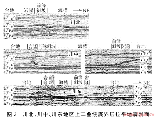 圖3是川北、川中及川東地區(qū)橫跨海槽的上二疊統(tǒng)底界層拉平區(qū)域地震剖面,可見其上二疊統(tǒng)地震相特征可分為以下4種類型:①連續(xù)、準(zhǔn)平行、厚度時(shí)差大,延伸遠(yuǎn)地震相,代表了開闊海臺(tái)地沉積;②出現(xiàn)上隆、上覆層反射結(jié)構(gòu)橫向明顯變化、窄范圍異常地震相預(yù)示了生物巖隆有利相帶;③整體呈前積反射結(jié)構(gòu)、向海盆方向呈下超地震相,屬臺(tái)地前緣斜坡相;④在深水和深水盆地區(qū),地震相展示了以連續(xù)、強(qiáng)振幅和朝深水區(qū)方向時(shí)差明顯減少為特征。前緣
