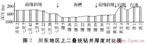 由于沉積環(huán)境不同,淺水臺(tái)地沉積速率大于深水海槽,其臺(tái)地沉積厚度明顯厚于海槽沉積存度;而在臺(tái)緣帶上,由于前積作用及各種海洋生物大量堆積所形成的碳酸鹽巖,使地層厚度增大。圖2是橫穿川東“開江-梁平”海槽相帶的上二疊統(tǒng)鉆井厚度對比直方圖,它直觀地反映出臺(tái)地厚度朝海槽方向變薄的區(qū)域前積沉積現(xiàn)象。