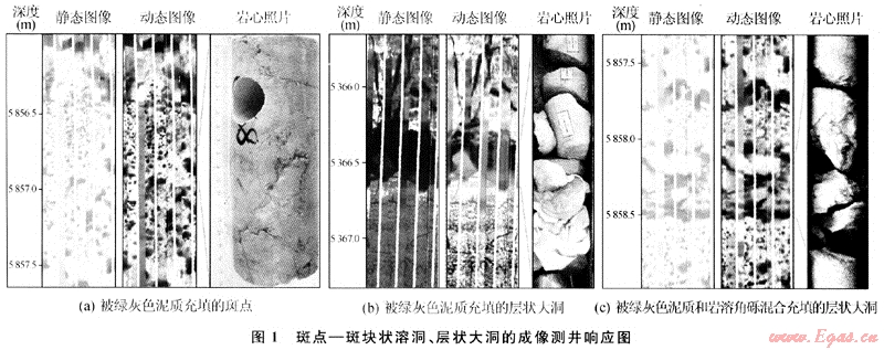 溶洞是碳酸鹽巖最重要的儲集空間類型之一,其成因復(fù)雜,分布的非均質(zhì)性強烈,預(yù)測難度很大[1]。前人多從露頭、巖心、常規(guī)測井及三維地震等資料的分析開展溶洞型碳酸鹽巖儲層的預(yù)測研究。筆者在巖心刻度和常規(guī)測井標(biāo)定基礎(chǔ)上,根據(jù)FMI、EMI電成像測井資料,研究了塔里木盆地輪古東地區(qū)奧陶系碳酸鹽巖儲層中溶洞的類型、特征及分布。