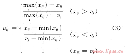 一般情況下,指標(biāo)按性質(zhì)可分為正指標(biāo)、逆指標(biāo)和中性指標(biāo)。此外,由于不同指標(biāo)之間的量綱不一樣,因而也必須對指標(biāo)數(shù)據(jù)進(jìn)行無量綱化處理。根據(jù)指標(biāo)性質(zhì)分別為3種類型指標(biāo)設(shè)計了相應(yīng)的指標(biāo)處理函數(shù)。