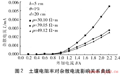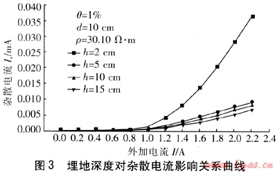 在上述條件下,埋地深度對雜散電流影響關系曲線見圖3。由圖3可知,在其他實驗條件不變的情況下,隨著金屬管道埋地深度的增加,在外加電流相同情況下,金屬管道內(nèi)的雜散電流逐漸減小,并且減小的幅度隨著埋地深度的增加也逐漸減小,即在一定條件下,金屬管道的埋地深度存在著一個極限值,當埋地深度大于這個極限值時,雜散電流基本保持不變。