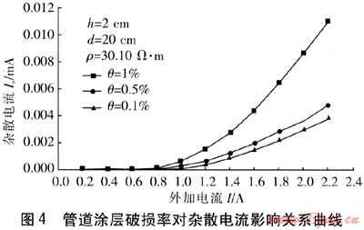 金屬管道埋地深度為h=2cm,管道與電阻絲水平凈距為d=20cm,土壤電阻率為ρ=30.10Ω·m,涂層破損率分別為θ=1%、0.5%、0.1%。在上述條件下,管道涂層破損率對雜散電流影響關系曲線見圖4。從圖4可以看出,在一定土壤電阻率條件下,隨著管道涂層破損率的增大,在相同外加電流條件下,管道內(nèi)的雜散電流也逐漸增大。因此,要減小管道內(nèi)雜散電流,就必須降低埋地金屬管道的涂層破損率,提高其表面防護性能,減少雜散電流對埋地金屬管道的腐蝕危害。