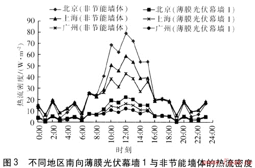 經(jīng)計(jì)算可得,不同地區(qū)南向薄膜光伏幕墻2與節(jié)能墻體的熱流密度見圖4。相比薄膜光伏幕墻1,節(jié)能墻體結(jié)合薄膜光伏組件后的節(jié)能率較低,經(jīng)計(jì)算得,節(jié)能率可達(dá)34%。