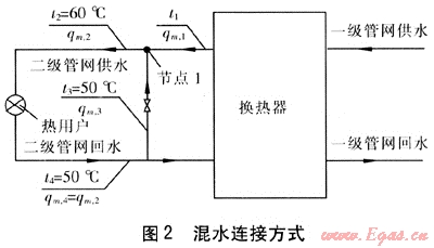 ① 板式換熱器是一種傳熱系數(shù)高、結(jié)構(gòu)緊湊、適應(yīng)性強(qiáng)、拆洗較方便、節(jié)省材料的換熱器。在地板輻射供暖系統(tǒng)中,若采用傳統(tǒng)選型方法,反而需要加大換熱器面積以降低二級(jí)側(cè)的阻力,這無疑是浪費(fèi)。熱用戶與二級(jí)管網(wǎng)采用混水連接形式既可發(fā)揮板式換熱器高換熱效率的優(yōu)勢,又可降低換熱器二級(jí)側(cè)阻力,實(shí)現(xiàn)優(yōu)化設(shè)計(jì)。