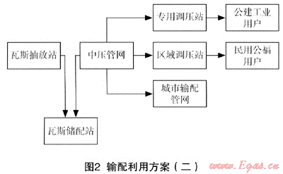 大中型煤礦瓦斯抽采一般分高低濃度兩套抽放系統(tǒng),這樣為高低濃度瓦斯的利用提供了有利條件。其中35%~45%高濃度瓦斯可以供應(yīng)礦區(qū)的民用、營業(yè)福利炊事、洗浴爐、燃氣鍋爐、熱風爐、工業(yè)爐窯等的自用氣,同時將大量的剩余瓦斯接入城鎮(zhèn)儲配、輸配系統(tǒng),供應(yīng)城市各類燃氣用戶用氣。輸配利用方案見圖2。
