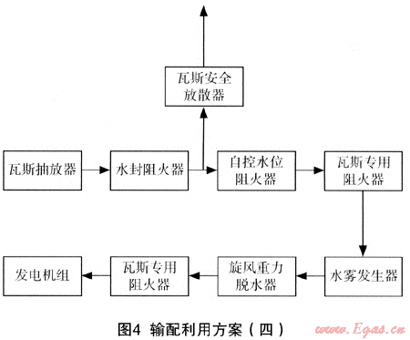 低濃度抽采系統(tǒng)安全性分析:低濃度瓦斯氣的抽采利用水環(huán)式真空泵的負壓進行,系統(tǒng)隨著壓力的下降爆炸上限下降,在負壓下運行大大提高了抽采系統(tǒng)的安全性。水環(huán)式真空泵在輸送瓦斯的同時加入了霧狀的水分,加大了瓦斯氣的濕度,保證了該輸送環(huán)節(jié)的安全性。輸配利用方案見圖4。