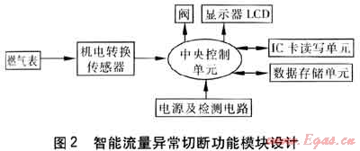智能流量異常切斷功能模塊設計的特點為:①對民用IC卡燃氣表的異常流量超限值進行參數設定。②自動實時計算流過燃氣表的瞬時流量。③自動識別統(tǒng)計恒流時間。④可設置表內恒流關閥時間、流量異常限值范圍、流量異常統(tǒng)計次數。⑤自動識別正常流量與異常流量,確保用戶使用燃氣不受干擾。⑥識別測試狀態(tài)與運行狀態(tài)的切換,不會影響置換等操作。