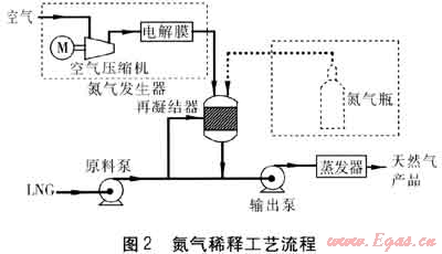 利用氮氣稀釋是調(diào)節(jié)熱值的重要手段,也是傳統(tǒng)的重?zé)N去除工藝之一,氮氣稀釋工藝流程見圖2。原料LNG經(jīng)原料泵增壓后進入再凝結(jié)器,在再凝結(jié)器中與氮氣(從空氣中提純或取自氮氣瓶)混合,再經(jīng)輸出泵增壓,經(jīng)蒸發(fā)器輸出。氮氣稀釋工藝中的輸出泵壓縮過程為液體壓縮,相比蒸餾塔分離工藝中的氣體壓縮,可以節(jié)省大量的電能,但是增加了昂貴的氮氣發(fā)生器或氮氣供應(yīng)系統(tǒng)。此外,如果氮氣的溫度不夠低,LNG與N2的混合過程和液體壓縮過程中將會產(chǎn)生大量的熵增。