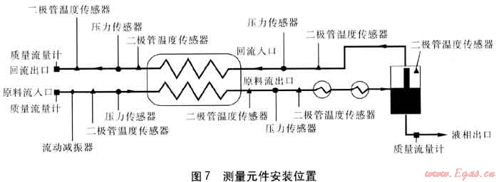 d. 測量及數(shù)據(jù)采集系統(tǒng)。溫度、壓力、流量測量元件安裝位置見圖7。測量數(shù)據(jù)均通過數(shù)據(jù)線上傳至計算機,采用LABVIEW 8.2軟件進行采集、記錄。