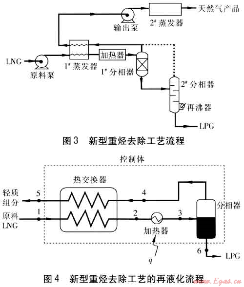 本文提出一種不同于以往的新型重?zé)N去除工藝:將過冷態(tài)LNG的冷能用于凝結(jié)從分相器內(nèi)重組分中蒸餾分離出來的輕質(zhì)LNG組分[1]。目前LNG的冷能利用[2~7]主要有:冷能發(fā)電、空氣分離、冷凍倉庫、液化二氧化碳、熱電循環(huán)等。本文將冷能的應(yīng)用范圍擴大至再液化流程。