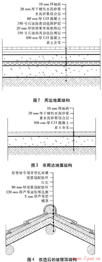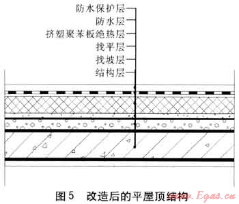 對(duì)于占17.5%的平屋頂,通常采用的絕熱措施是將熱導(dǎo)率小、吸水率低并具有一定強(qiáng)度的輕質(zhì)絕熱材料設(shè)置在防水層與找平層之間。改造后的平屋頂結(jié)構(gòu)見(jiàn)圖5。改造后不僅能夠有效控制屋頂傳熱系數(shù),而且能使結(jié)構(gòu)層受到保護(hù)而不致受到過(guò)大的溫度應(yīng)力,避免結(jié)構(gòu)層內(nèi)表面結(jié)露甚至結(jié)凍。
