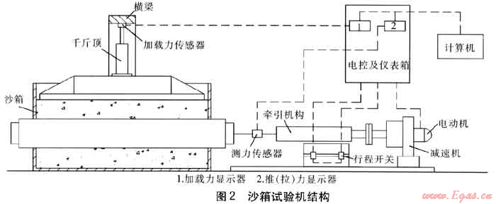 沙箱試驗(yàn)機(jī)由沙箱、加載機(jī)構(gòu)、牽引機(jī)構(gòu)、電氣控制、測(cè)力傳感器、行程開(kāi)關(guān)、計(jì)算機(jī)等部分組成。沙箱試驗(yàn)機(jī)結(jié)構(gòu)見(jiàn)圖2,牽引機(jī)構(gòu)、加載機(jī)構(gòu)外形分別見(jiàn)圖3、4。牽引機(jī)構(gòu)由擺線針輪減速機(jī)、電動(dòng)機(jī)、傳動(dòng)部件等組成,牽引機(jī)構(gòu)通過(guò)測(cè)力傳感器與工作管相連。試驗(yàn)時(shí)牽引機(jī)構(gòu)在行程開(kāi)關(guān)的配合下使工作管作直線往復(fù)運(yùn)動(dòng)(每個(gè)行程100mm),測(cè)力傳感器通過(guò)顯示器顯示推力、拉力。沙箱試驗(yàn)機(jī)可在空載、加載狀況下進(jìn)行操作,在進(jìn)行加載試驗(yàn)時(shí)通過(guò)千斤頂對(duì)試件加載,加載力傳感器通過(guò)顯示器顯示加載力。由計(jì)算機(jī)計(jì)算空載時(shí)平均推(拉)力與加載時(shí)平均推(拉)力的比值。沙箱兩側(cè)焊接20號(hào)槽鋼,并焊接橫梁支撐,便于安裝千斤頂(見(jiàn)圖4)。沙箱底部設(shè)置與牽引機(jī)構(gòu)、電控及儀表箱相連的支座。