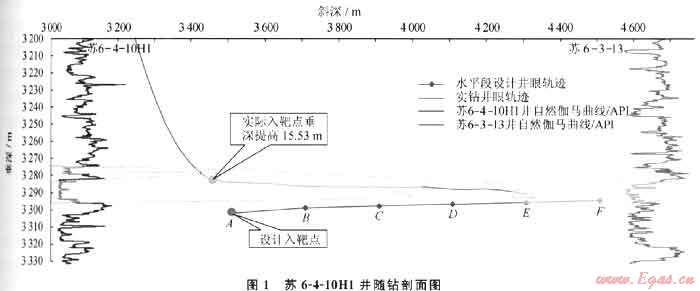 如按設(shè)計(jì)深度1m入靶,鉆達(dá)目標(biāo)層頂部井斜角不應(yīng)低于86°才能滿足施工要求。目前水平井設(shè)計(jì)靶距多在400m,并且目標(biāo)層還存在提前或推后等情況,一旦推后,井斜過(guò)大不但追蹤困難,還增加無(wú)效靶前距。典型井蘇6-4-10H2,在鉆至設(shè)計(jì)海拔深度時(shí)見氣層,后降斜至84°穩(wěn)斜探砂頂,在設(shè)計(jì)海拔以6.9m處鉆遇目標(biāo)層,靶前距為486.81m,超設(shè)計(jì)86.81m。