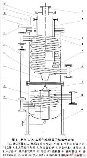 關(guān)鍵詞:LNG加熱氣化裝置;煙氣自擊回旋;結(jié)構(gòu)設(shè)計;氣流旋水子;錐形煙氣噴口;自動注水;試驗研究
