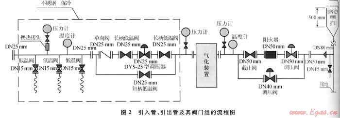 每個貯液罐的出口處均裝有公稱直徑為15mm的低溫球閥,閥后均用公稱直徑為15mm的金屬軟管與工質(zhì)引入管連接,引入管的一端封死,另一端連接在上盤管進(jìn)口集箱的下封蓋上。引入管上裝有閥門組,起到阻止低溫工質(zhì)回流、截止管路流通和調(diào)節(jié)管道壓力等作用。引出管上也裝有閥門組,同樣起到截止管路流通和調(diào)節(jié)管道壓力等作用,其流程圖如圖2所示(圖2中所示LNG加熱氣化裝置的左側(cè)為引入管閥門組的流程圖,右側(cè)為引出管閥門組的流程圖)。引出管閥門組后裝有阻火器,以防室外雷電等回火進(jìn)入裝置。阻火器后的引出管管徑擴(kuò)大為80mm,沿實驗室外墻升到屋頂上空,將氣化后的天然氣排入大氣。為消除排氣引起的噪音,排氣管道末端裝有擴(kuò)口消音器,并裝有避雷針,防止雷擊。