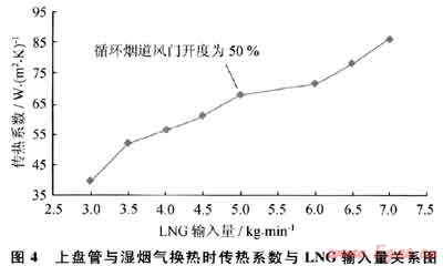 圖4為上盤管與濕煙氣換熱時傳熱系數(shù)與LNG輸入量的關(guān)系圖。反映了當(dāng)燃料天然氣輸入熱負(fù)荷不變、循環(huán)煙道調(diào)風(fēng)門的開度為50%時,濕煙氣與上盤管換熱的傳熱系數(shù)與LNG輸入量之間的關(guān)系,此時上盤管外濕煙氣量基本不變,傳熱系數(shù)的變化主要由管內(nèi)LNG的對流換熱系數(shù)決定。隨著LNG輸入量的增大,其管內(nèi)流速上升,導(dǎo)致上盤管傳熱系數(shù)增大,且隨著LNG輸入量的增大,在輸入熱負(fù)荷不變時,其溫升下降,從而增大了管內(nèi)外的傳熱溫差,促進(jìn)了傳熱。