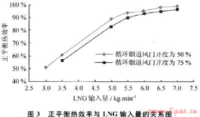 圖3為正平衡熱效率與LNG輸入量的關(guān)系圖。從圖3可以看出,裝置正平衡熱效率隨工質(zhì)LNG輸入量的增大而提高,當(dāng)循環(huán)煙氣量增大(即循環(huán)煙道調(diào)風(fēng)門的開度從50%增大到75%)時,裝置正平衡熱效率反而降低,原因是循環(huán)煙氣量增大,導(dǎo)致混合煙氣溫度降低,使傳熱溫差減小,LNG的吸熱量降低。