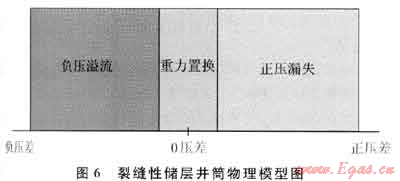 由于裂縫性儲(chǔ)層不滿足達(dá)西滲流條件,滲流阻力很小,導(dǎo)致井內(nèi)壓差沒有安全窗口,取而代之的是一個(gè)很小的重力置換窗口。壓差小于重力置換窗口發(fā)生負(fù)壓溢流;大于重力置換窗口,發(fā)生正壓漏失;在重力置換窗口內(nèi),有溢有漏,處于動(dòng)態(tài)交換狀態(tài)。裂縫性儲(chǔ)層井筒物理模型如圖6所示。