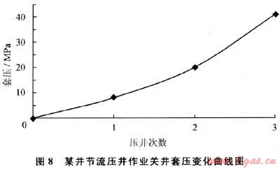 某井于2007年6月4日12:O0鉆至井深6694.O0m時(shí)發(fā)生溢流,外溢量0.02m3,關(guān)井立壓4MPa,套壓0MPa。連續(xù)進(jìn)行了3次正循環(huán)節(jié)流壓井作業(yè),但每次壓井作業(yè)后關(guān)井套壓越來越高,說明井筒內(nèi)溢流未能有效排出,并且還有較大幅度的增加,嚴(yán)重威脅到井筒安全,宣告正循環(huán)節(jié)流壓井作業(yè)失敗。該井正循環(huán)節(jié)流壓井作業(yè)關(guān)井套壓變化情況如圖8所示。