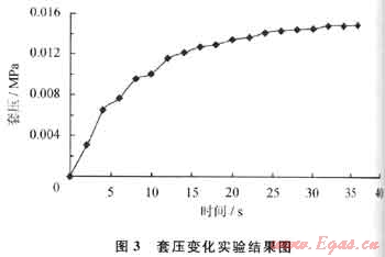 溢流關(guān)井后,由于氣體滑脫上升,將導(dǎo)致井筒壓力發(fā)生變化,而井筒壓力變化與井筒——儲(chǔ)層的連通情況有密切的關(guān)系。開展裂縫性儲(chǔ)層溢流關(guān)井后套壓變化規(guī)律實(shí)驗(yàn)研究,有利于搞清楚裂縫性儲(chǔ)層溢流關(guān)井后井筒壓力變化機(jī)理。實(shí)驗(yàn)結(jié)果如圖3所示。