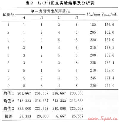 從表2可知,泡沫的攜液量都在150mL以上,其攜液能力(攜液能力=泡沫攜帶出的液體體積/總泡排劑溶液的體積×100%)[3]都在75%以上。因此,以起始泡高(0s)為考察指標(biāo)進(jìn)行分析,樣品L-2(D)是影響實(shí)驗(yàn)結(jié)果的最主要因素,單一表面活性劑L-1(A)。甜菜堿(B)和銨鹽(C)次之,最佳因素水平組合為A3B3C1D3。由于該配比不在原設(shè)計(jì)的試驗(yàn)方案中,為驗(yàn)證該配比的真實(shí)性,以該配比進(jìn)行起泡能力和攜液能力的測(cè)定,結(jié)果測(cè)得該配比的起始泡高度為265mm,攜液量為176.5mL。與表2中的8號(hào)試驗(yàn)結(jié)果相比,可證明該配比是9次試驗(yàn)中最優(yōu)的。因此通過正交設(shè)計(jì)實(shí)驗(yàn)確定泡排劑LYB-1的最佳質(zhì)量配比為L-1(A):甜菜堿(B):銨鹽(C):L-2(D)=5:3:3:8。