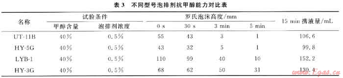為了充分說明泡排劑LYB-1具有較強(qiáng)的抗甲醇能力,30℃時(shí)將該泡排劑與現(xiàn)場(chǎng)應(yīng)用較多的泡排劑UT-118、HY-5G和HY-3G進(jìn)行了對(duì)比,試驗(yàn)結(jié)果見表3。表3數(shù)據(jù)表明,泡排劑LYB-1具有較強(qiáng)的抗甲醇能力,明顯優(yōu)于其他3種泡排劑。