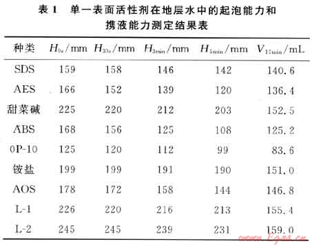 為了研究單一表面活性劑對(duì)地層水的起泡能力和攜液能力,用傾注法測(cè)定了室內(nèi)自制表面活性劑L-1和L-2以及市面銷售的表面活性劑十二烷基本磺酸鈉(ABS)、α-烯基磺酸鈉(AOS)、脂肪醇聚氧乙烯醚硫酸鹽(AES)、十二烷基磺酸鈉(SDS)、辛基酚聚氧乙烯10醚(OP-10)、甜菜堿和銨鹽的起泡能力和攜液能力,并記錄了0s、30s、3min和5min的泡沫高度及15min的泡沫攜液量(表1)。實(shí)驗(yàn)泡排劑溶液濃度為0.5%,總液體量為200mL,地層水礦化度為4.7×104mg/L,水型為CaCl2型,實(shí)驗(yàn)溫度為30℃。