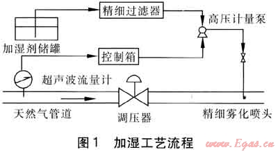 結(jié)合青島市燃?xì)夤芫W(wǎng)的實(shí)際運(yùn)行情況,自行設(shè)計(jì)了噴霧加濕工藝流程,見圖1。