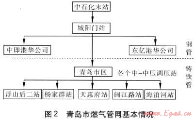 青島市燃?xì)夤芫W(wǎng)的基本情況見圖2。市區(qū)所使用的天然氣主要來自中石化末站,經(jīng)過城陽(yáng)門站計(jì)量后,分別供給青島市區(qū)、中即港華公司和東億港華公司。中即港華公司和東億港華公司所建管網(wǎng)全部采用鋼管,不存在接口漏氣現(xiàn)象,因此不需要加濕。進(jìn)入市區(qū)的天然氣先經(jīng)過21km輸氣管道后分到各中-中壓調(diào)壓站,經(jīng)調(diào)壓后進(jìn)入中壓B管網(wǎng)。這21km輸氣管道也全部是鋼管,因此也不存在接口漏氣現(xiàn)象。