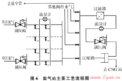 40口先導(dǎo)性試驗(yàn)項(xiàng)目井中,在氣田內(nèi)建設(shè)集氣站,增壓到0.6MPa后經(jīng)過(guò)外輸管道輸送到CNG加氣站,通過(guò)CNG罐車(chē)外銷(xiāo)。由于集氣站建設(shè)在氣田內(nèi),所以集氣站內(nèi)建設(shè)有1個(gè)閥組,氣體進(jìn)入閥組后,首先調(diào)壓,壓力調(diào)整為0.2MPa,單井產(chǎn)氣可利用閥門(mén)倒換流程進(jìn)行單井輪換計(jì)量。集氣站閥組產(chǎn)氣和其他閥組來(lái)氣在匯管進(jìn)行匯合,經(jīng)過(guò)過(guò)濾分離、總計(jì)量和調(diào)壓后進(jìn)入集氣站壓縮機(jī)增壓,壓力增加到0.6MPa后,進(jìn)入外輸管道,送往CNG站。該集氣站主要流程如圖6所示。
