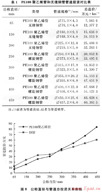 工程設(shè)計(jì)階段,對(duì)PE100聚乙烯管和無(wú)縫鋼管投資情況進(jìn)行了詳細(xì)的比較,主要比較了公稱直徑50~600mm的PE100聚乙烯管和無(wú)縫鋼管的安裝費(fèi)、建筑費(fèi)、主材費(fèi)、預(yù)制費(fèi)和總造價(jià)等。由于穿越工程和水工保護(hù)隨現(xiàn)場(chǎng)情況變化較大,在比較過(guò)程中未考慮穿越工程和水工保護(hù)費(fèi)用。各規(guī)格PE100聚乙烯管和無(wú)縫鋼管的比較數(shù)據(jù)見(jiàn)表1[8]。