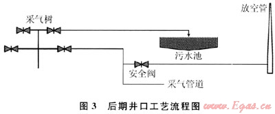 在該段流程中,水通過(guò)抽油機(jī)從油管中抽出,直接排放到井場(chǎng)附近的排污池,自然蒸發(fā)。煤層氣從套管和油管間的環(huán)形空間產(chǎn)出,通過(guò)采氣管道,進(jìn)入煤層氣采集系統(tǒng),系統(tǒng)壓力為0.2MPa。當(dāng)采氣系統(tǒng)檢修時(shí),打開(kāi)放空閥,通過(guò)放空管把井口里的煤層氣連續(xù)排放到大氣中。該井口工藝流程及如圖3所示。