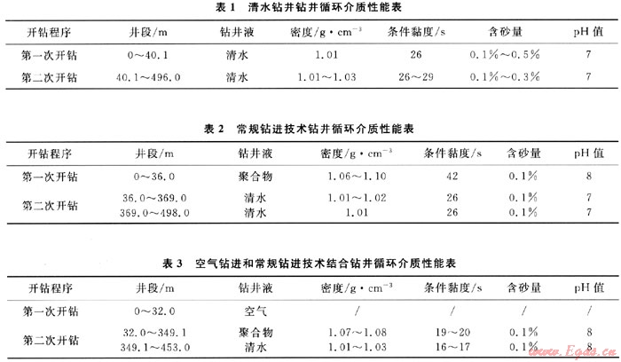 2) 空氣鉆井在井身質(zhì)量方面比水鉆井稍好一些,但相差不大;空氣鉆井在時(shí)效方面比水鉆井效率高,其機(jī)械鉆速是水鉆機(jī)械鉆速的3倍多,因此空氣鉆井周期短,綜合經(jīng)濟(jì)效益好。