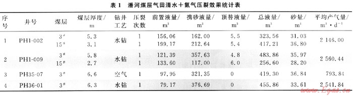 該區(qū)內(nèi)采用清水+氮氣壓裂的4口井均已投入排采并產(chǎn)氣,4口井平均產(chǎn)氣量為2010.53m3/d,其統(tǒng)計數(shù)據(jù)見表1。
