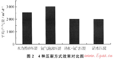 采用4種壓裂方式的壓裂效果對比如圖2所示。從圖2中可以看出:氮氣泡沫壓裂效果最好,壓裂井的平均產(chǎn)氣量為3 037.47m3/d;其次是活性水加砂壓裂壓裂的井,平均產(chǎn)氣量為2540.77m3/d;清水+氮氣壓裂、清水加砂壓裂效果相差不大,分別為2010.53m3/d和1998.88m3/d。