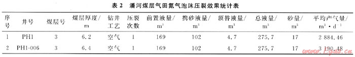 潘河煤層氣田采用氮氣泡沫壓裂的2口井均已投入排采并產(chǎn)氣,其統(tǒng)計數(shù)據(jù)如表2所示。根據(jù)統(tǒng)計,2口井采用氮氣泡沫壓裂后平均產(chǎn)氣量為3037.47m3/d,增產(chǎn)效果顯著。