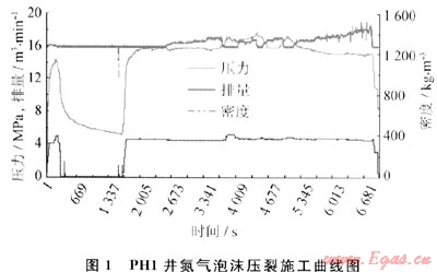 潘河示范工程項目采用研制的泡沫壓裂液進(jìn)行2口井的氮氣泡沫壓裂,圖1為PH1井的氮氣泡沫壓裂施工曲線圖。