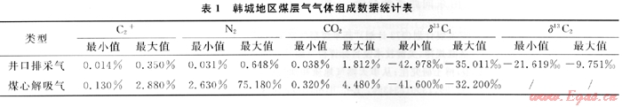 通過對(duì)韓城地區(qū)煤層氣演化過程分析,該區(qū)煤層熱演化程度較高,煤層氣主要以熱成因氣為主,盡管在后期改造作用中研究區(qū)的東部煤層出露于地表,可能遭受大氣降水等因素的影響,但煤層氣碳同位素值(通常把δ13C1<-55‰認(rèn)為是生物成因氣)的特征表明并沒有生物氣的混入。
