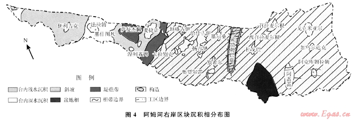 在阿姆河右岸地區(qū)西北部H2S含量普遍較高的背景下,有少量氣田H2S含量低,這些低H2S含量的氣田,正好位于開闊臺地深水沉積區(qū)(圖4),沉積物較細(xì),類似于東南部高伽馬泥巖層,有較好的封隔性能,從而阻止了烴類和膏鹽巖的直接接觸,硫酸鹽熱化學(xué)還原反應(yīng)不能夠大量發(fā)生,造成H2S含量較低。